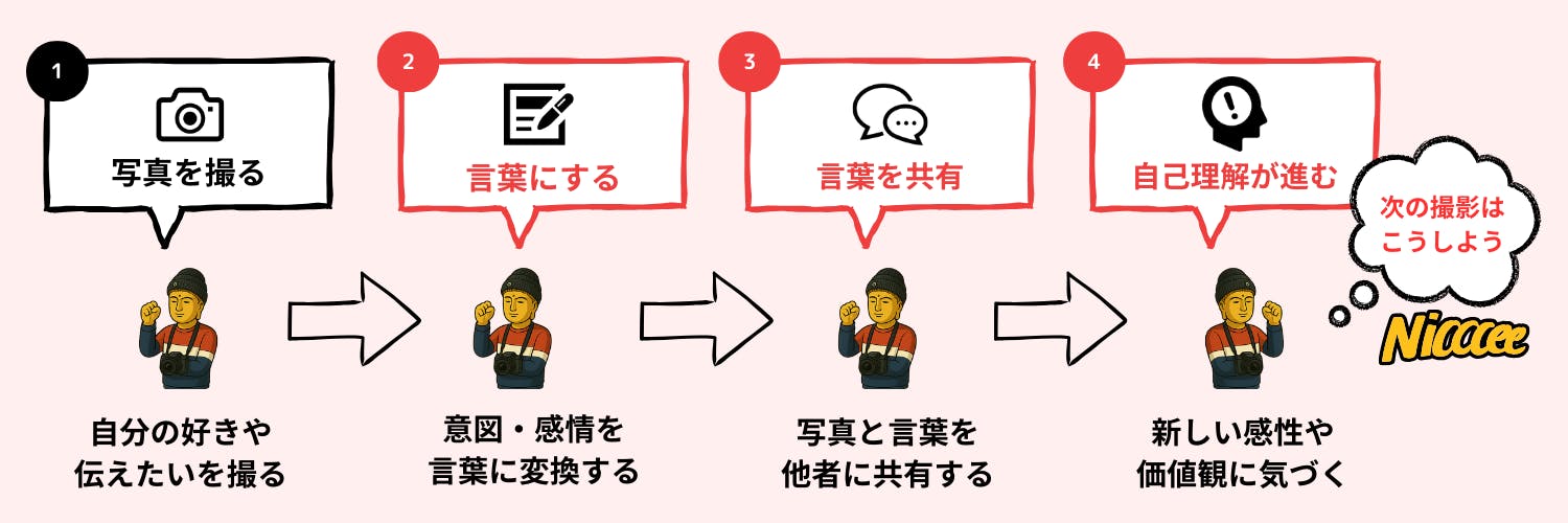 「SNS」や「フォトコン」といった外的評価も大事なことだと思います。ただ、それらを急ぐのではなく、まずはこのサイクルを通じて自分の感性や価値観を整理し、その上で写真と向き合う。