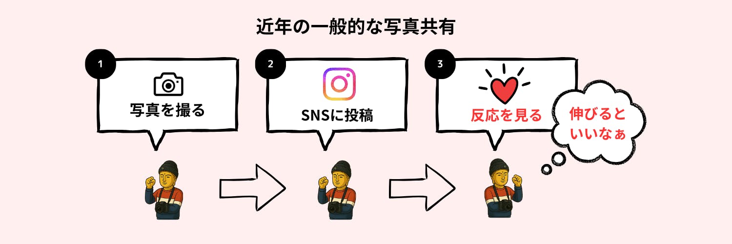 近年の写真共有は、SNSに投稿して「いいね」を待ち、結果に一喜一憂する。