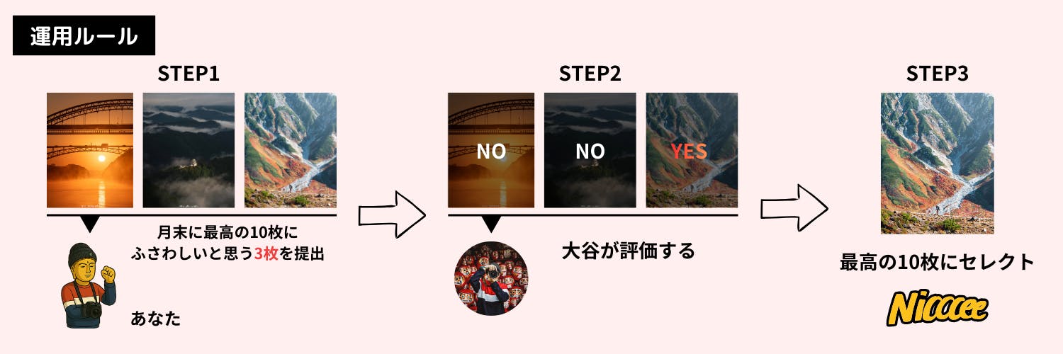 • 提出写真から「最高の10枚」にふさわしいかを大谷の価値観に基づいて判断します。