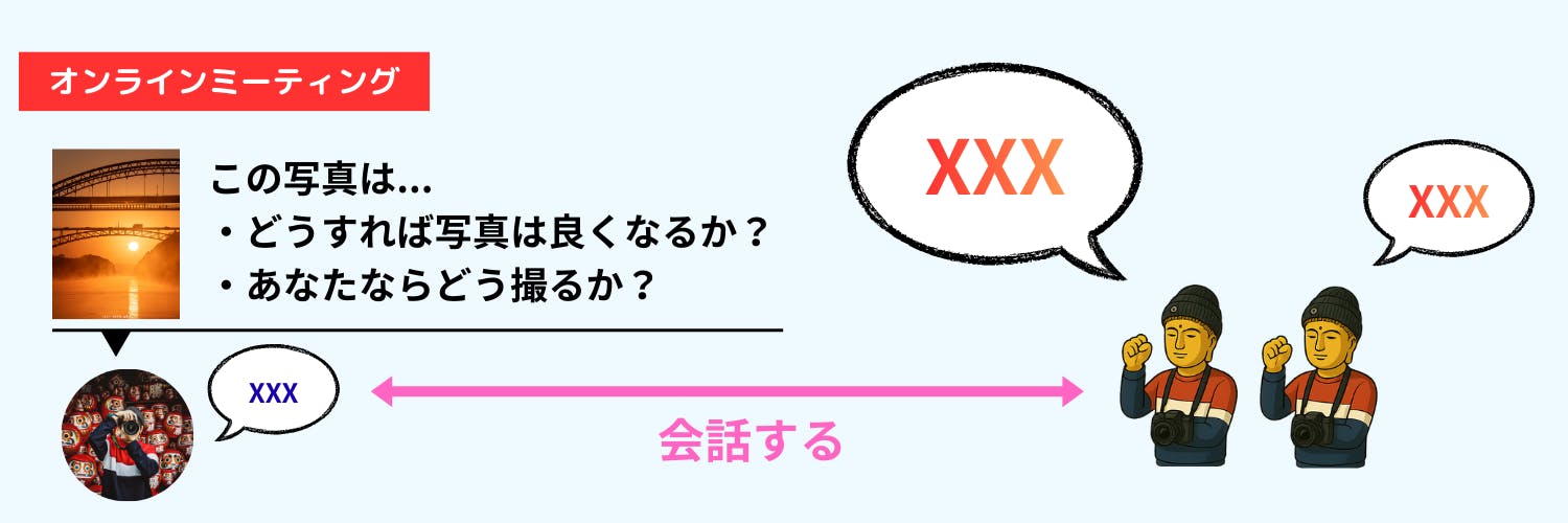 過去の作品ではなく、今現在の自分の感性を言葉にすることで、表現の解像度を上げます。それに対し、大谷がコメント(感想/共感/発見/改善案)を行い、あなたの「撮影意図の深掘り」と「整理」を手助けし、次の撮影に繋げます。
