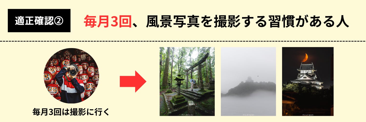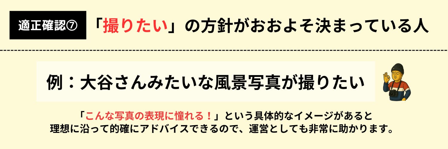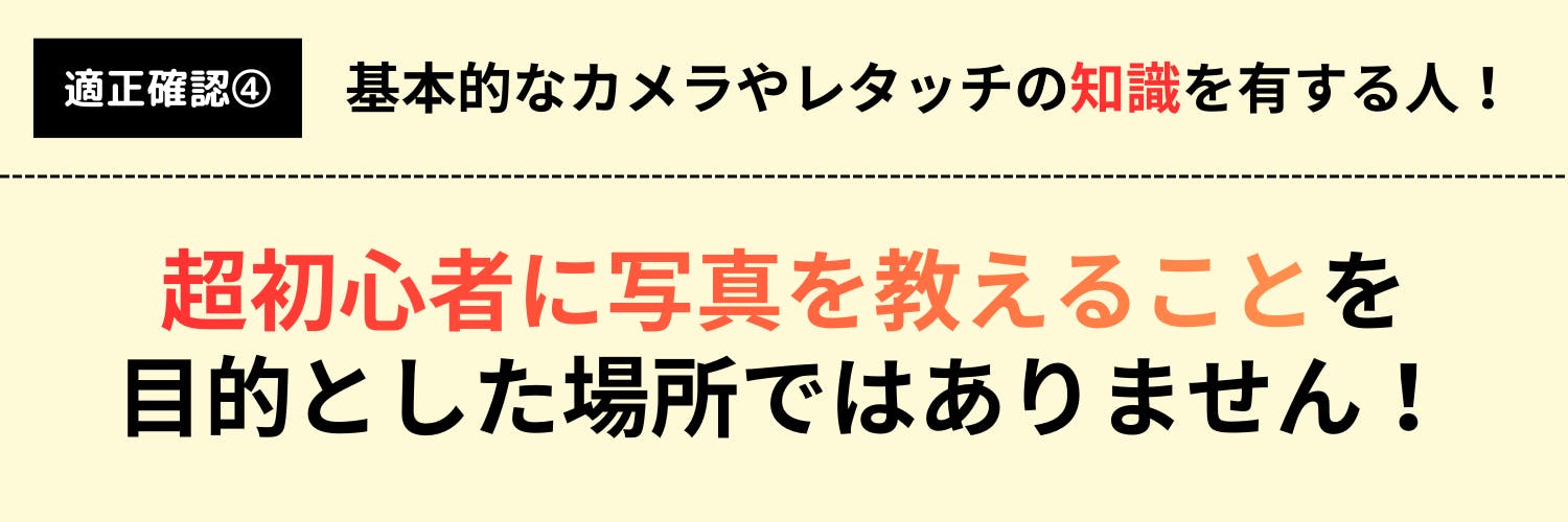「カメラを買ったばかり」という初心者の方には、難しい環境です。「一通りの撮影はきるが、その先の壁を感じている」という方に最も価値を感じていただける設計にしています。
